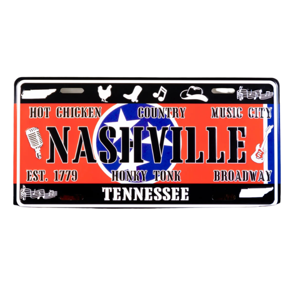 This colorful metal novelty license plate that reads Nashville Honky Tonk Tennessee contains a whole host of images and words associated with Nashville, Tennessee including images of guitars, microphones, cowboy hats and music notes.