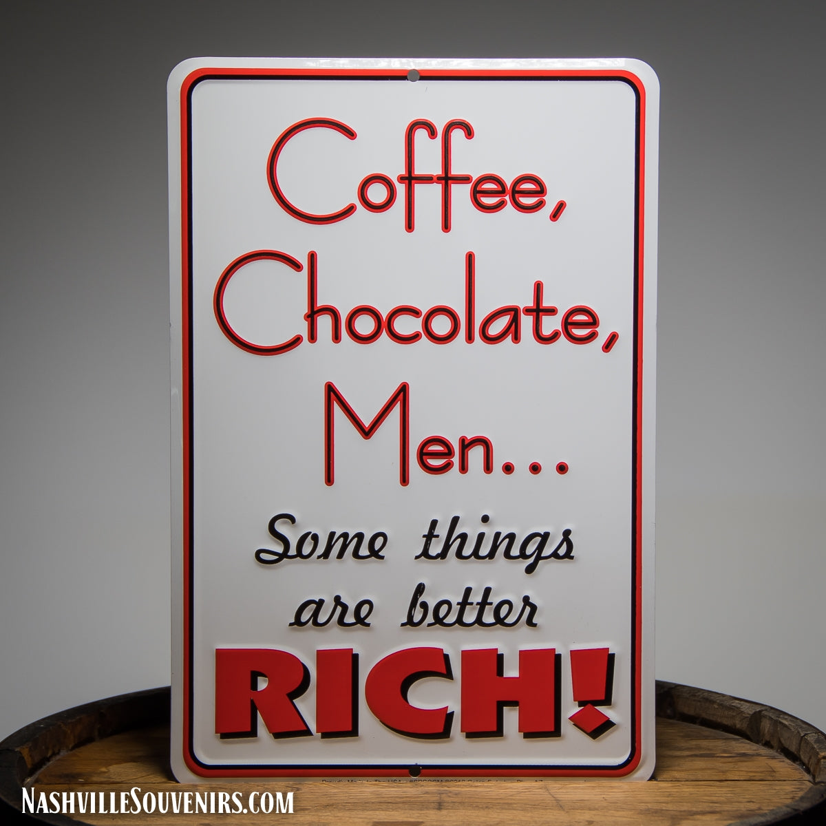 Description Novelty tin sign that reads, Coffee, Chocolate, Men, Some things are better Rich!