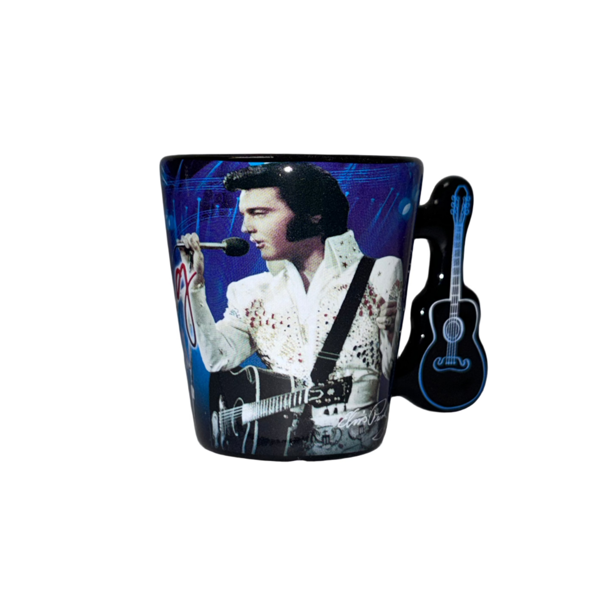 This Elvis Presley shot glass features a vibrant blue performance design with detailed artwork and a unique guitar shaped handle that makes it stand out.