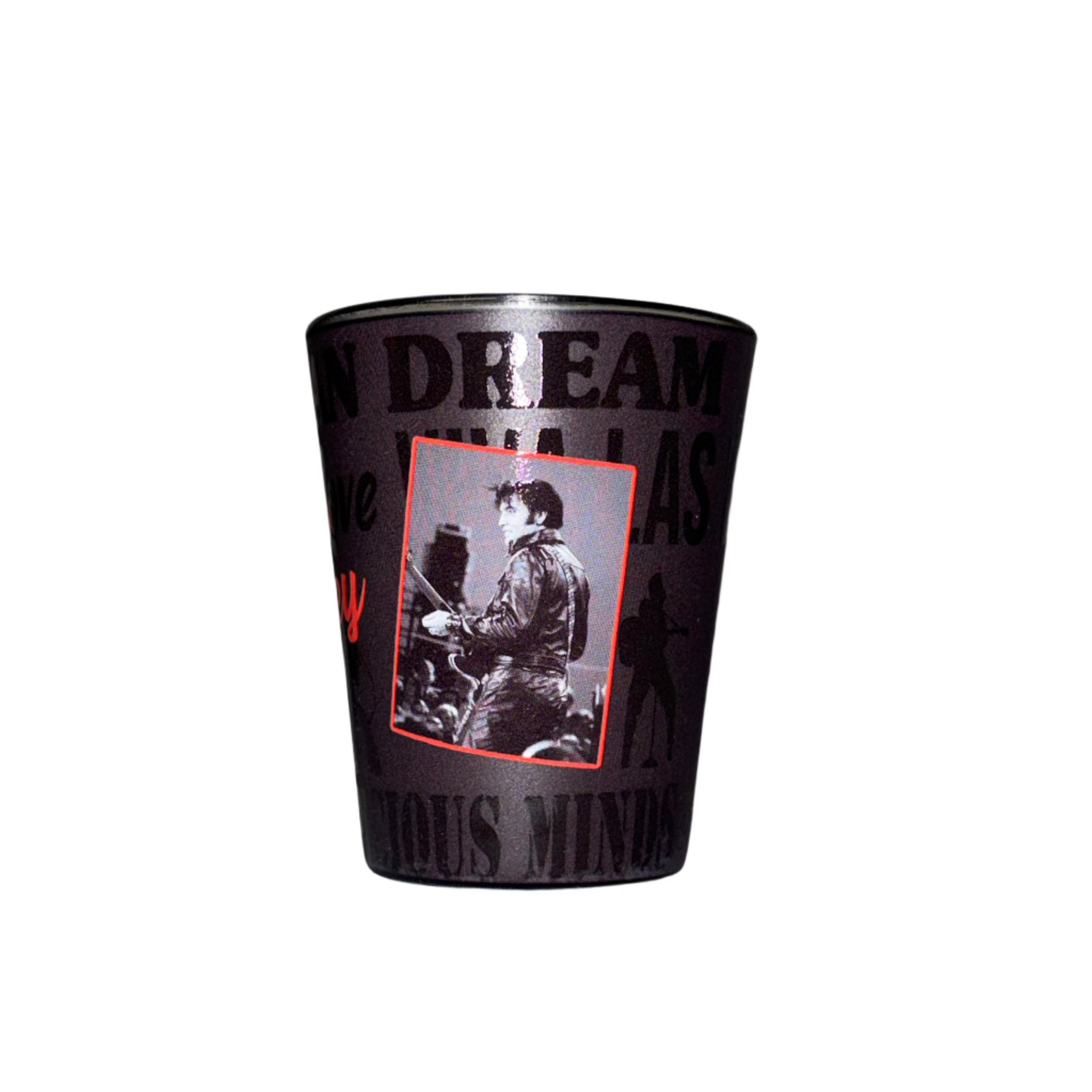 This Elvis Presley shot glass features a bold black background with red accents and a classic performance photo for a dramatic, vintage look. The “Viva Las Vegas” inspired design wraps around the glass, giving it a collectible style that stands out on any shelf.