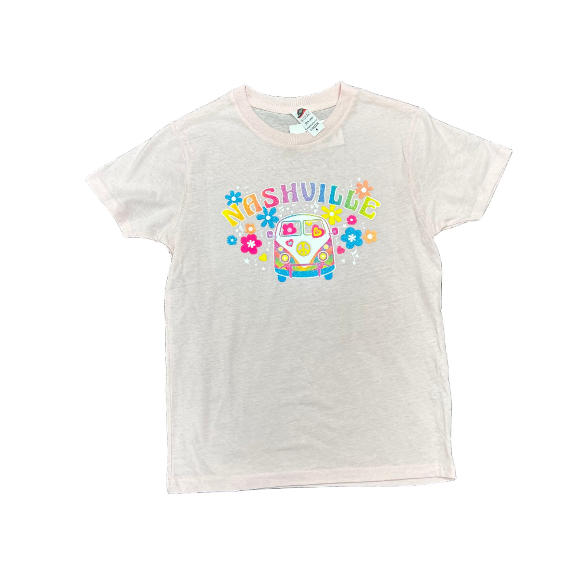 This adorable youth tee brings all the retro vibes! Printed on a soft pink shirt, it features a colorful, groovy Nashville van surrounded by bright flowers and cheerful rainbow colors.