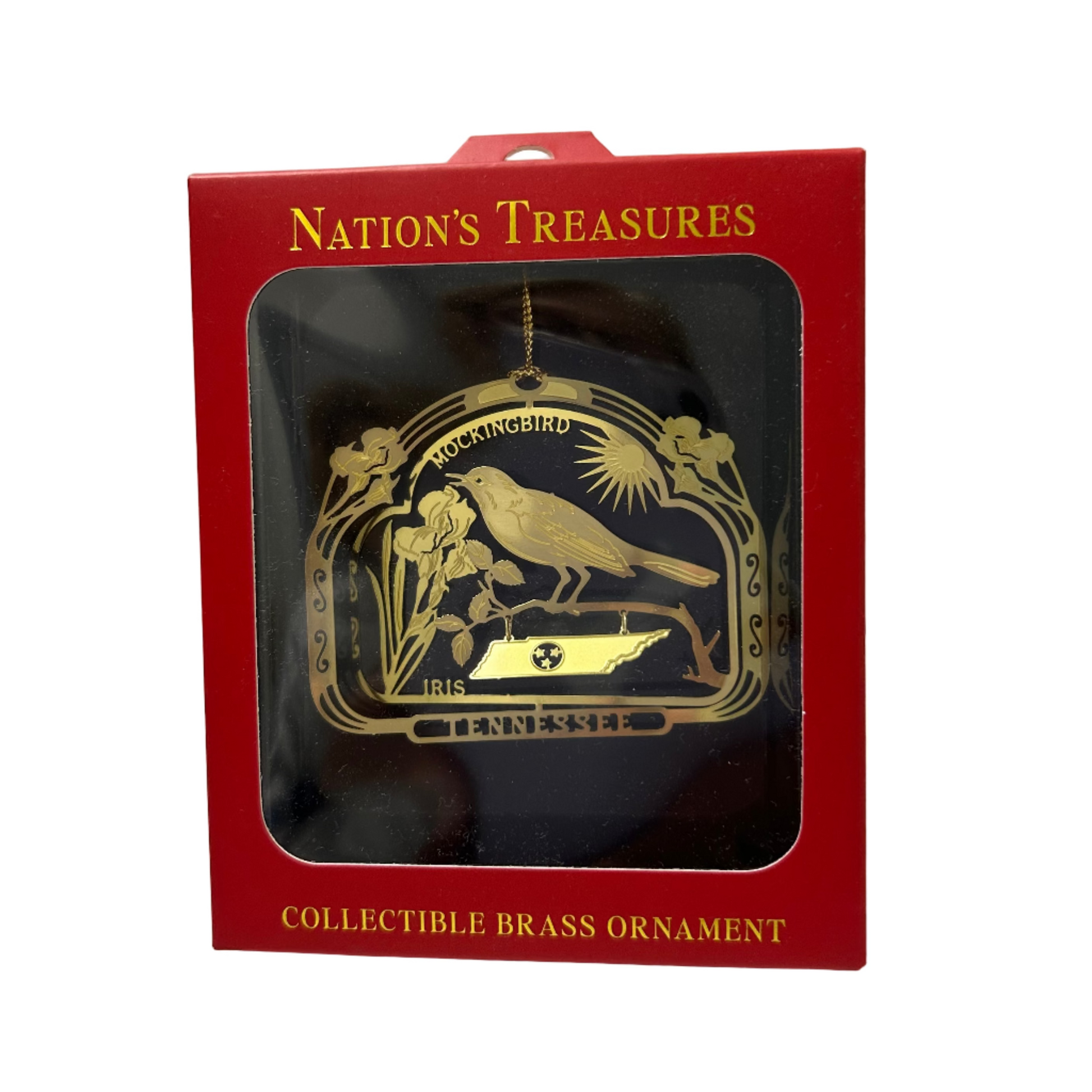 This elegant Tennessee State Bird & Flower Brass Ornament from the Nation’s Treasures collection beautifully honors the Volunteer State’s natural symbols. Crafted from solid brass, it showcases the Northern Mockingbird perched among Iris flowers, with the Tennessee state outline and flag featured alongside.