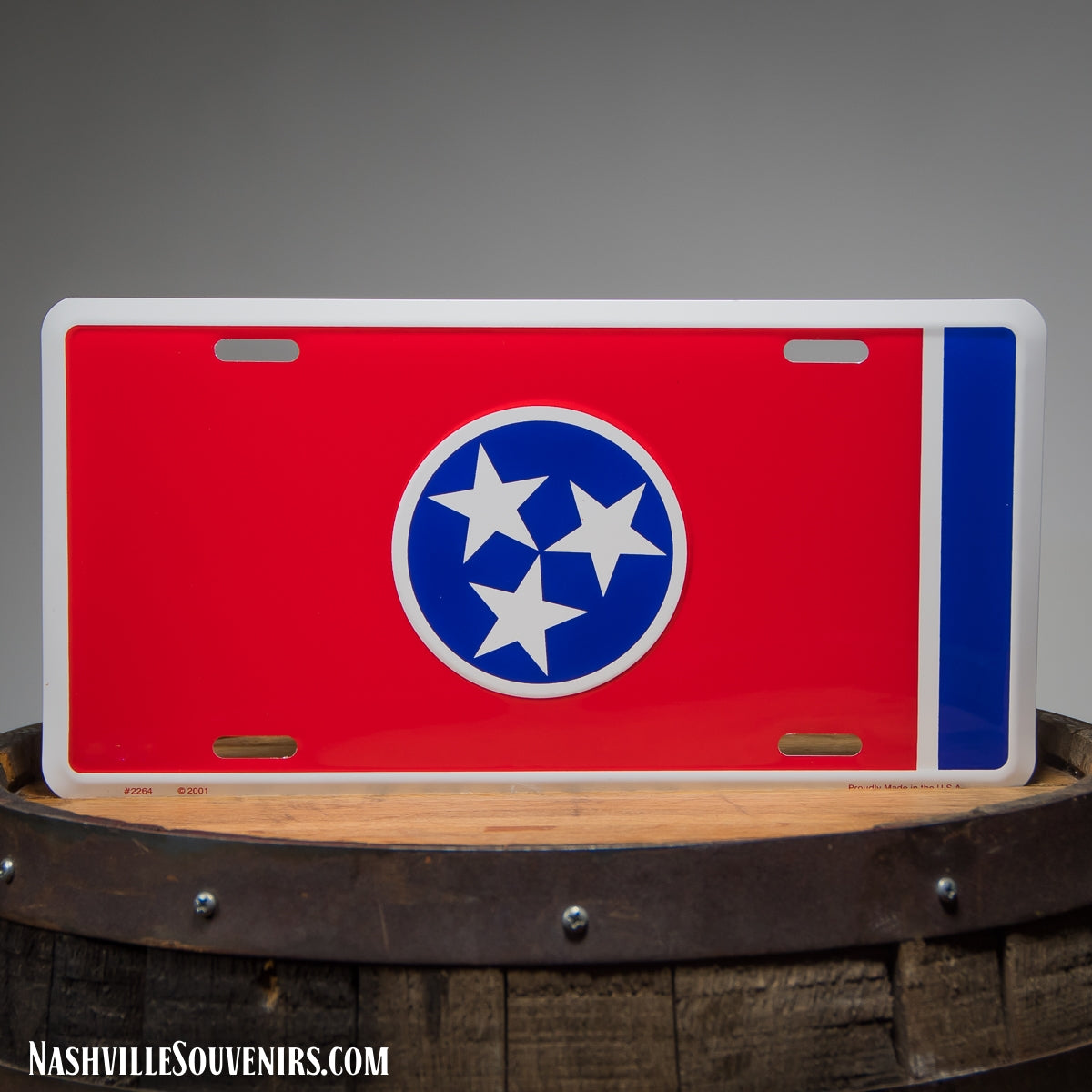 Description Metal novelty license plate with an image of the Tennessee State Flag, also known as the Tennessee Tri Star License Plate.