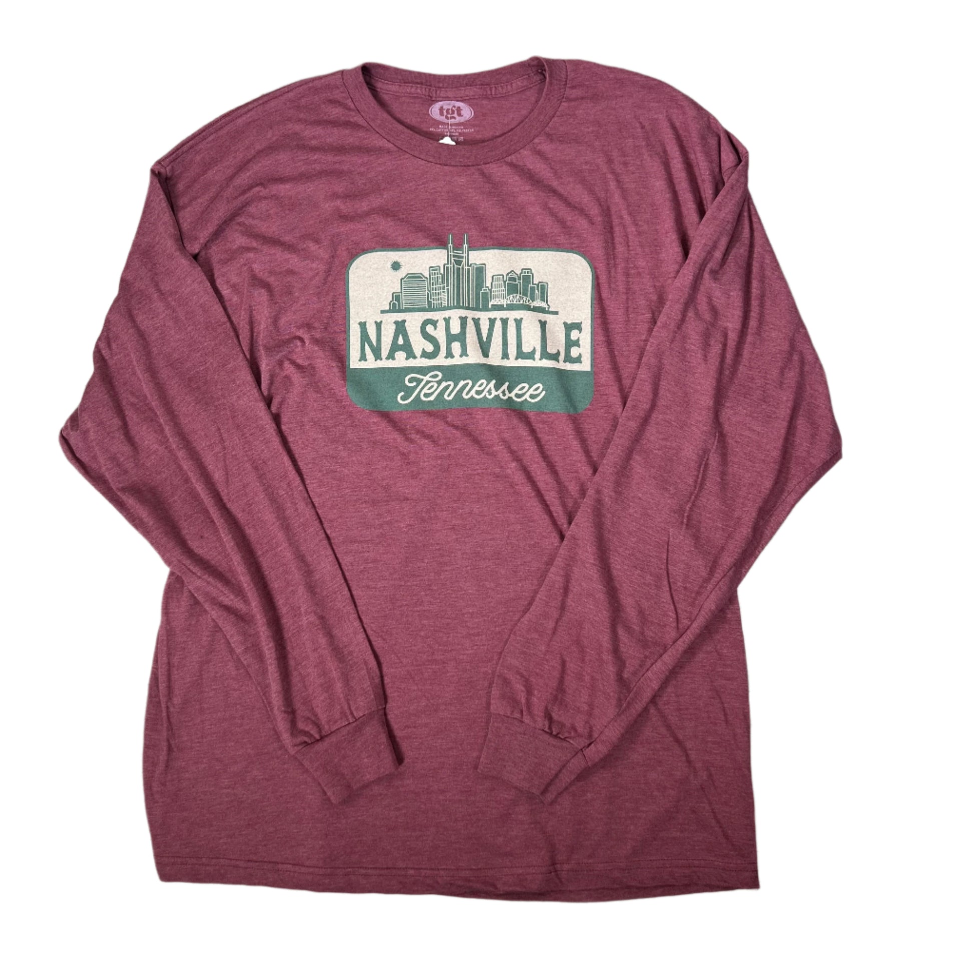 This stylish and comfortable Nashville long sleeve is perfect for a brisk night out at the honky tonks! It features a beautiful Nashville Skyline with the words "Nashville, Tennessee" underneath, all printed on a soft Green or Maroon shirt.