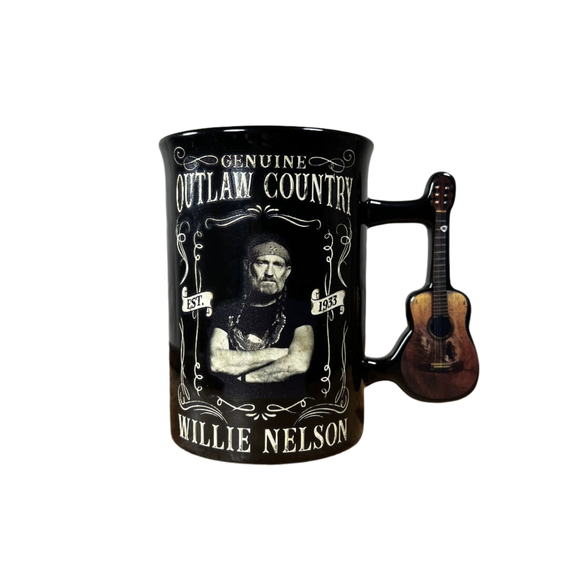 Enjoy your morning coffee or tea in your Willie Nelson "Outlaw Country" mug. It features a great design with Willie Nelson's image, the words "Genuine Outlaw Country", and his guitar "Trigger" as the handle.