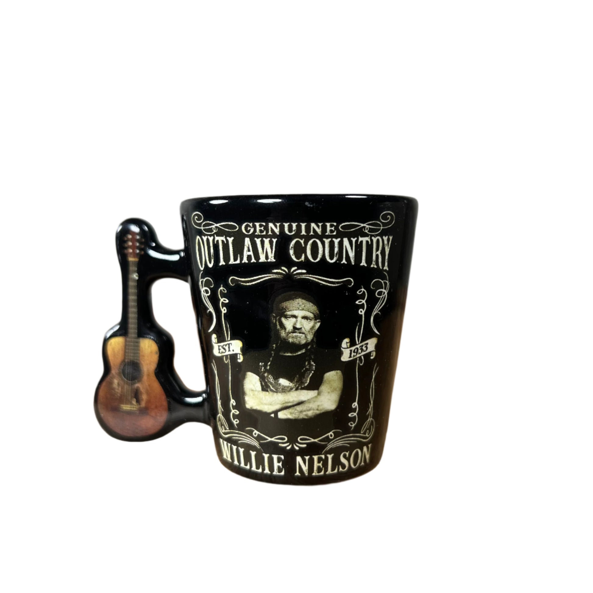 Represent your favorite country legend with this super fun Willie Nelson "Outlaw Country" shot glass! Featuring a picture of Willie and his trusted guitar "Trigger" as the handle; it's a perfect gift for any Willie fan!